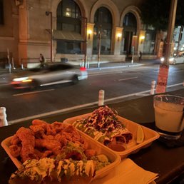 This dive bar is usually active on weekends. Great for hanging with friends late nights in dtla. The staff are friendly and make brilliant drinks, but also taco stand on patio. I ordered a mocktail pineapple drink and a mezcal margarita. The bar tender gave warm service and awesome drinks. Went to the patio for tacos, only pork and beef available. Tortilla mad with corn, slightly thicker but still a nice snack in between drinks. Layer of flavors, mild house salsa and juicy tacos. Definitely order the tacos if you're not vegan and drinking. There's live entertainment some nights and spacious with nonslip floors. Restrooms located next to bar.